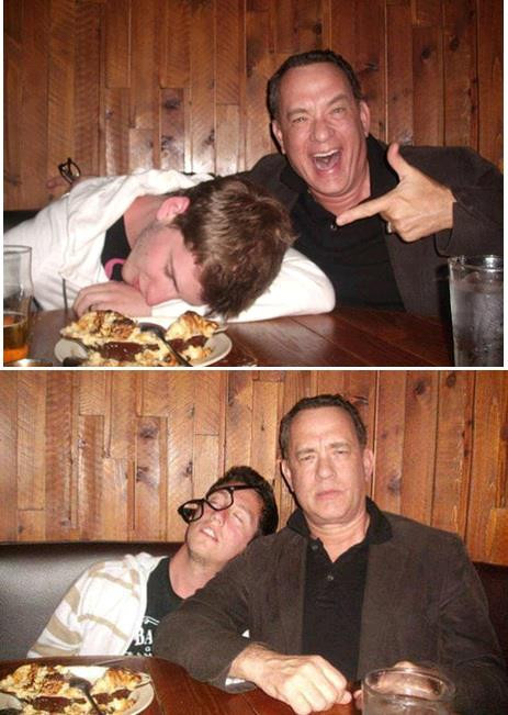 Tom Hanks được nhớ đến là ngôi sao thích "photobombs". Năm 2012, anh gây sốt khi đăng tải những tấm ảnh cùng một cậu sinh viên say tại quán pizza ở Bắc Dakota.
