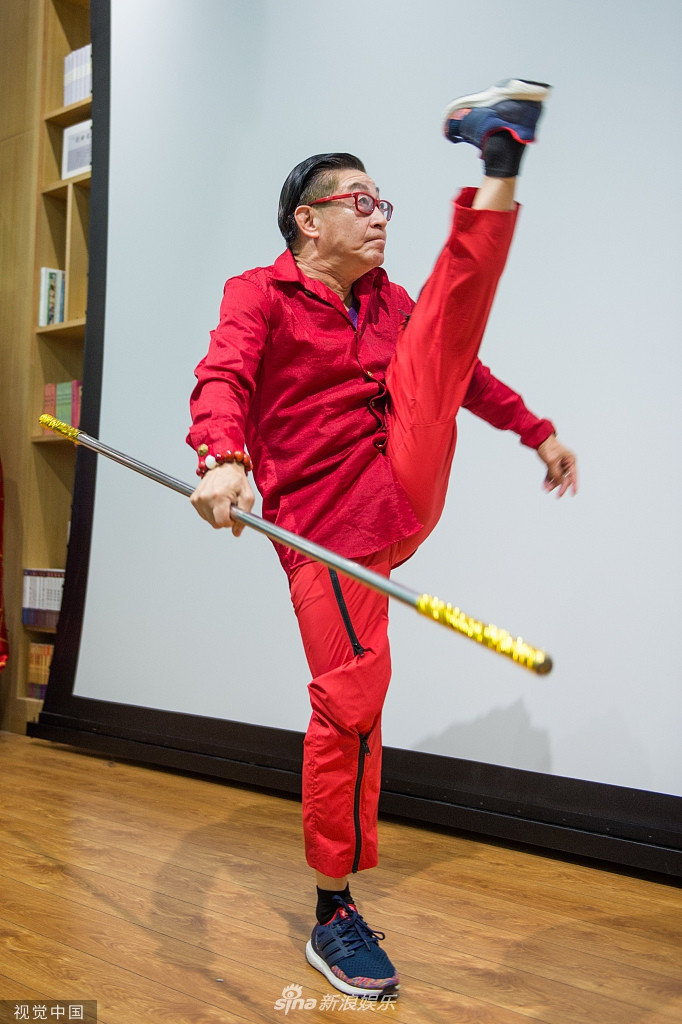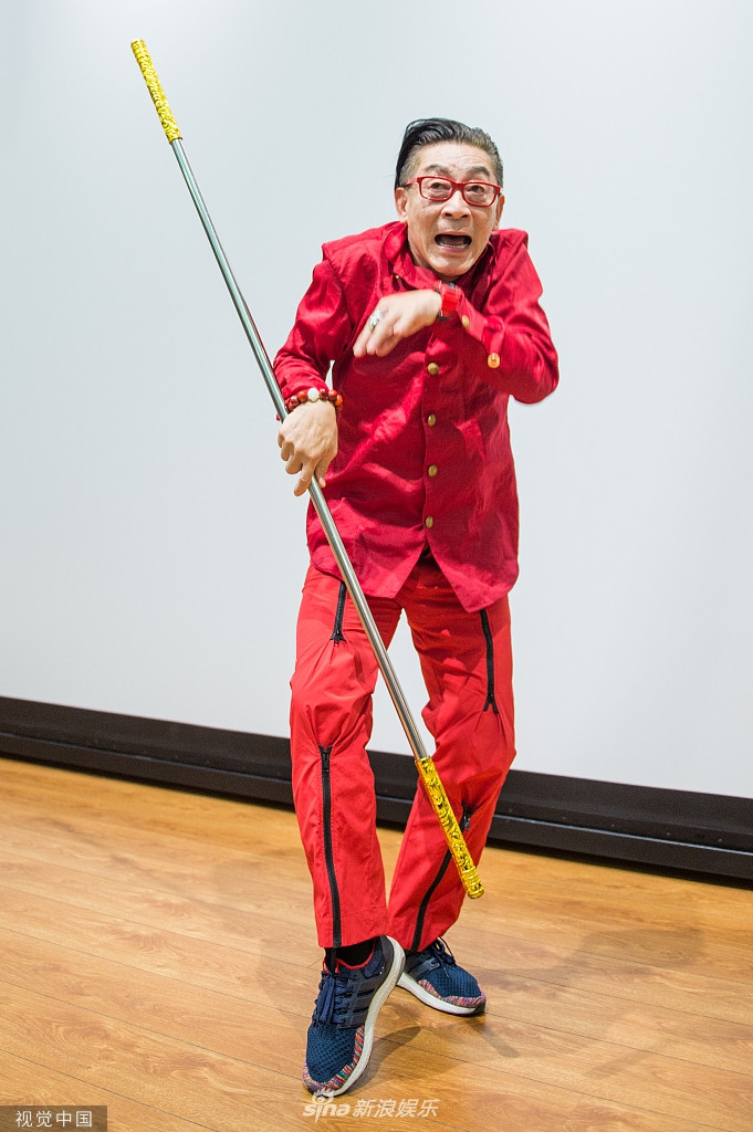 "Tôn Ngộ Không" diện bộ cánh màu đỏ, đeo kính gọng đỏ nổi bật. Trông ông vẫn rất phong độ ở tuổi 60.