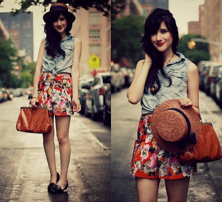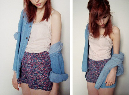 Hãy thử kết hợp denim và quần short hoa to nổi bật.