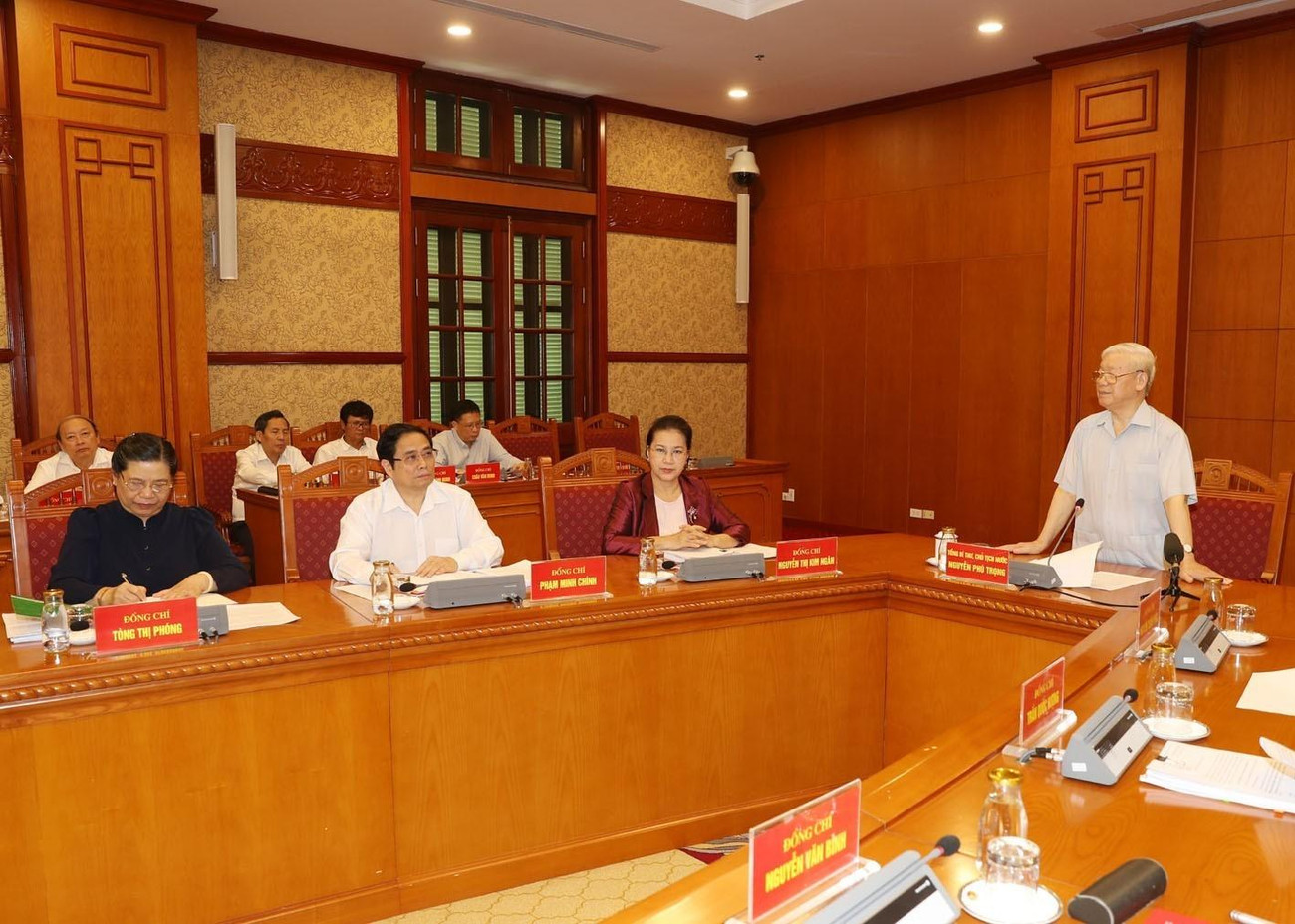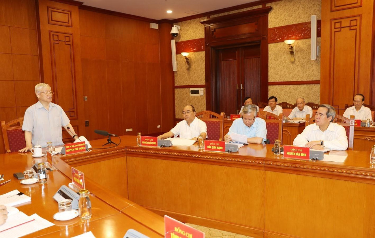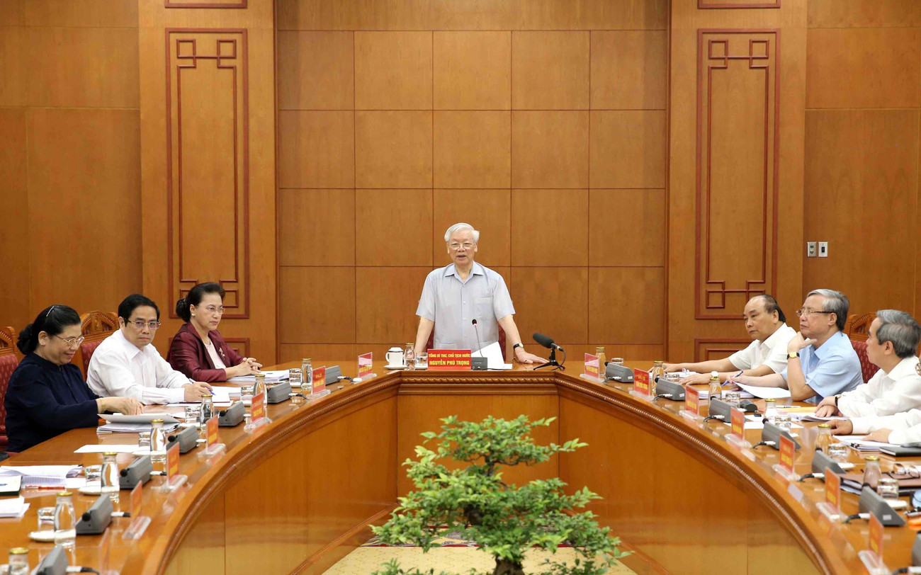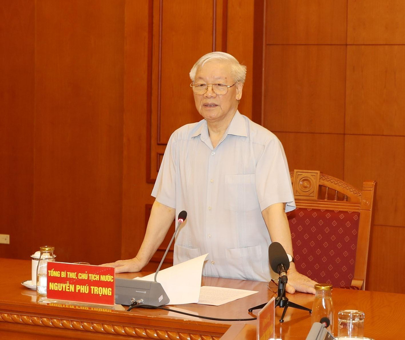 Tổng Bí thư, Chủ tịch nước Nguyễn Phú Trọng, Trưởng Tiểu ban Văn kiện Đại hội XIII của Đảng phát biểu chỉ đạo cuộc họp. (Ảnh: Trí Dũng)
