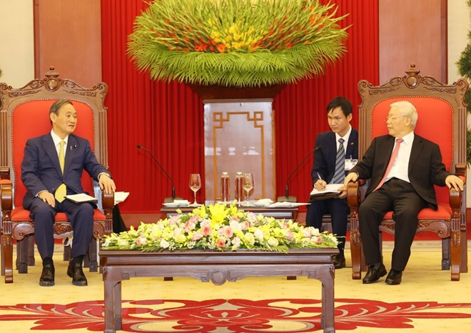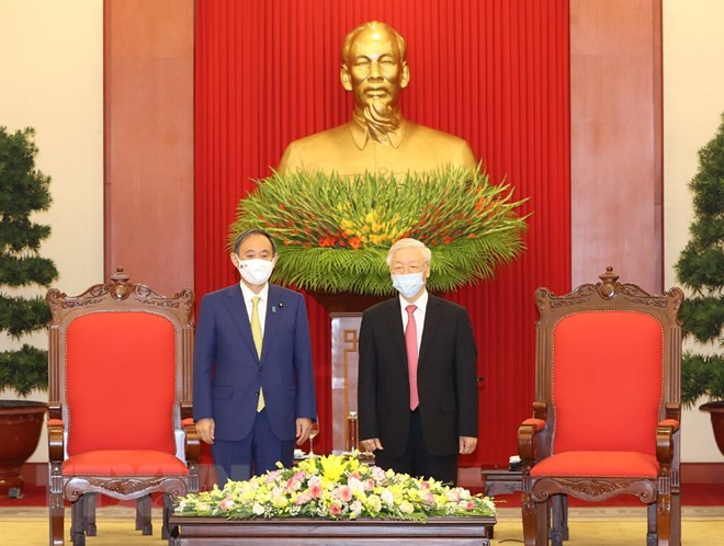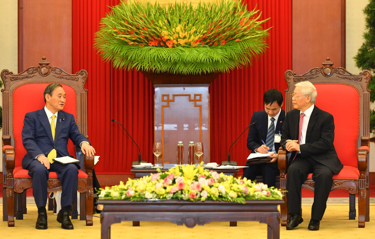 Tại buổi tiếp, Tổng Bí thư, Chủ tịch nước Nguyễn Phú Trọng đánh giá cao việc Thủ tướng Suga Yoshihide chọn Việt Nam là nước đến thăm đầu tiên sau khi nhậm chức, thể hiện sự coi trọng đặc biệt đối với Việt Nam và quan hệ hai nước.
