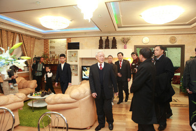 Tại đây, Tổng Bí thư đã có buổi gặp gỡ và nói chuyện với cán bộ Đại sứ Quán Việt Nam và bà con cộng đồng người Việt Nam đang sinh sống, làm việc tại Liên bang Nga.
