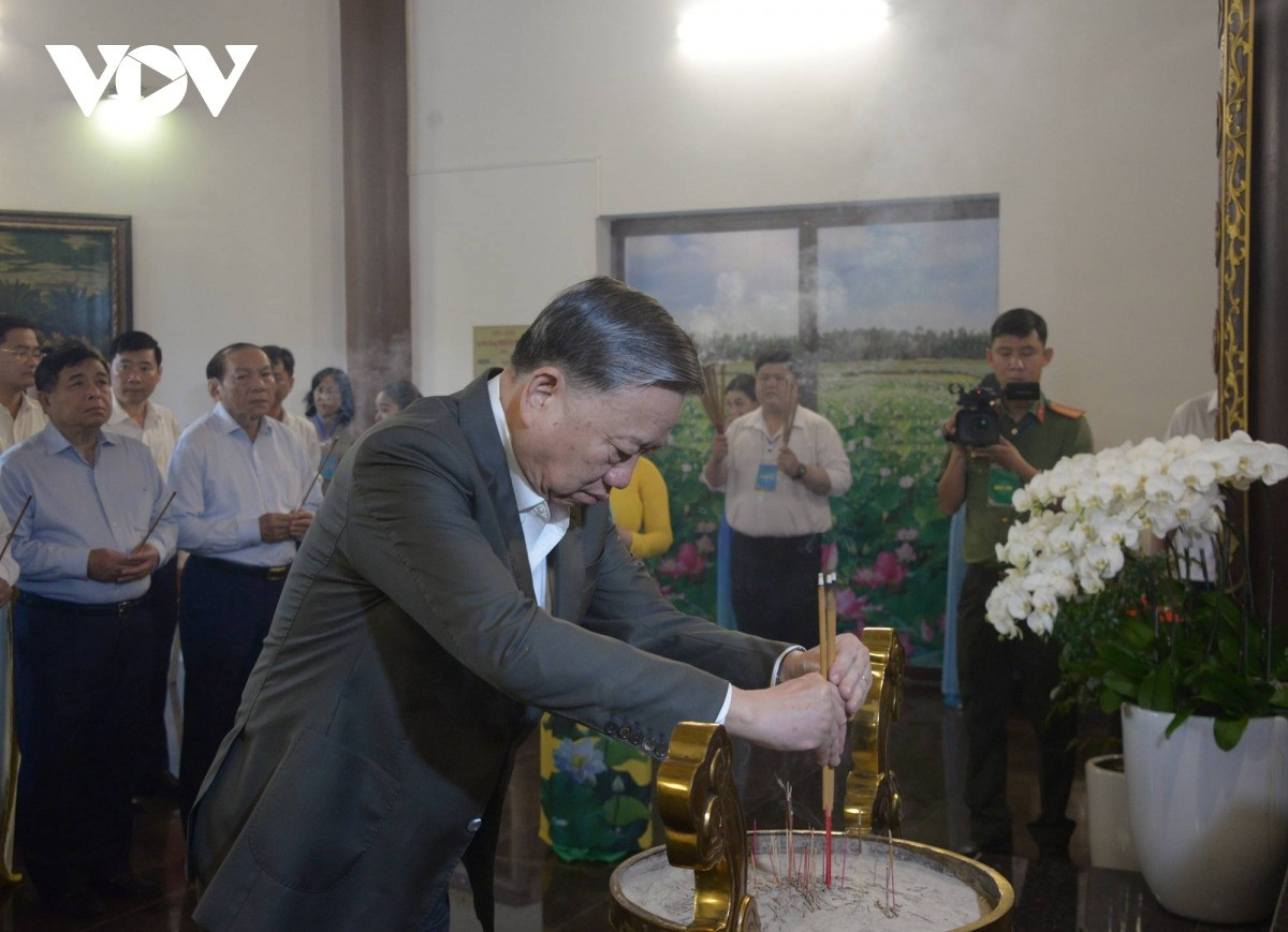 Trước đó vào đầu giờ sáng nay, Tổng Bí thư Tô Lâm đến dâng hương, dâng hoa Cụ Phó bảng Nguyễn Sinh Sắc - Thân sinh Chủ tịch Hồ Chí Minh tại Khu di tích Nguyễn Sinh Sắc, thành phố Cao Lãnh, viết sổ lưu niệm và trồng cây lưu niệm tại Khu di tích.