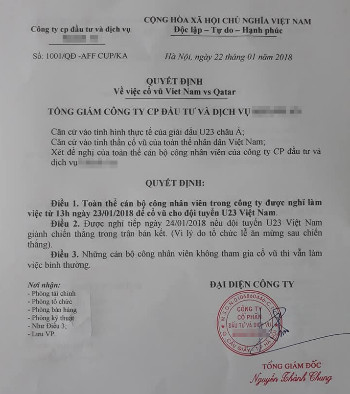Ngày 22/1, anh Nguyễn Thành Chung, Tổng giám đốc Công ty cổ phần đầu tư và dịch vụ ở Cầu Giấy (Hà Nội) quyết định cho toàn thể cán bộ, nhân viên nghỉ làm từ 13h ngày 23/1 để cổ vũ cho đội tuyển U23 Việt Nam. Nhân viên công ty được nghỉ luôn ngày 24/1 nếu đội tuyển U23 Việt Nam giành chiến thắng trong trận bán kết "vì lý do ăn mừng sau chiến thắng".