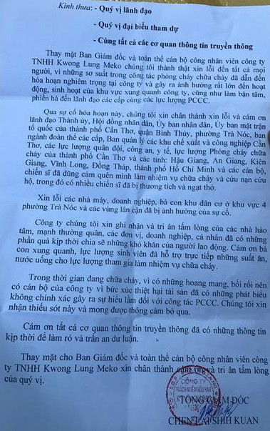“Qua sự cố hoả hoạn này, chúng tôi xin chân thành xin lỗi và cám ơn lãnh đạo Thành uỷ, Hội đồng nhân dân, UBND, Uỷ ban Mặt trận TP.Cần Thơ, quận Bình Thuỷ, phường Trà Nóc, ban, ngành đoàn thể các cấp, Ban quản lý các khu chế xuất và công nghiệp, lực lượng quân đội, công an, y tế, lực lượng phòng cháy chữa cháy của TP.Cần Thơ, TP.HCM và các tỉnh như Hậu Giang, An Giang, Kiên Giang, Vĩnh Long, Đồng Tháp đã dũng cảm quên mình làm nhiệm vụ, trong đó có nhiều chiến sĩ đã bị thương và ngạt thở”, ông Chen Lai Skuang, Tổng giám đốc Công ty Kwong Lung – Meko viết.