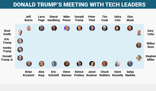 Hơn 10 lãnh đạo các hãng công nghệ lớn của Mỹ, trong đó có 3 công ty vốn hóa lớn nhất - Apple, Alphabet và Microsoft đã đến tham dự buổi họp hôm qua. Tổng vốn hóa của các công ty này hiện là hơn 3.056 tỷ USD.