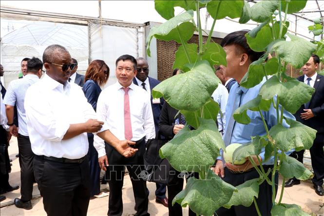 Tổng thống nước Cộng hòa Guinea-Bissau Umaro Sissoco Embaló thăm khu vực sản xuất dưa công nghệ cao. Ảnh: Mạnh Tú/TTXVN