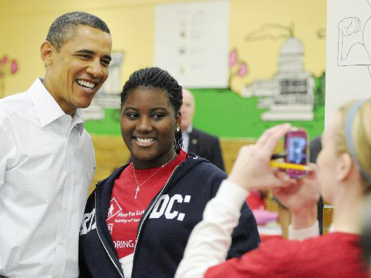 Tổng thống Mỹ Barack Obama cùng tham gia sơn quét, vẽ trên tường cùng các tình nguyện viên tại trường trung học Stuart-Hobson trên đồi Capitol, Washington để vinh danh Mục sư Martin Luther King Jr.