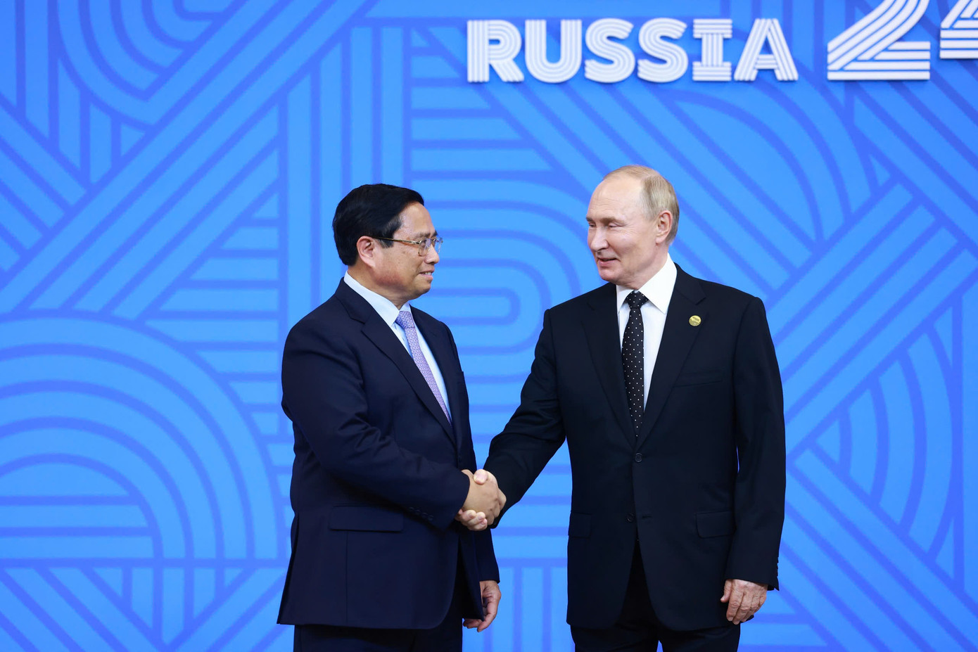 | Tổng thống Liên bang Nga Vladimir Putin, Chủ tịch Nhóm BRICS năm 2024 đón Thủ tướng Phạm Minh Chính. Ảnh: DG |