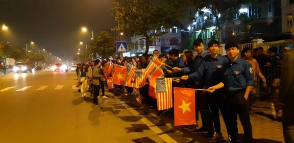 Tại trung tâm Hà Nội, hàng nghìn người dân đứng xung quanh JW Marriott chờ đoàn xe của Tổng thống Mỹ Donald Trump về khách sạn.
