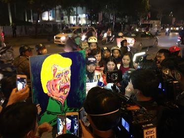 Người dân chụp ảnh cùng tác giả bức tranh vẽ Tổng thống Donald Trump - anh Hùng Cửu Long, đến từ TP Hồ Chí Minh