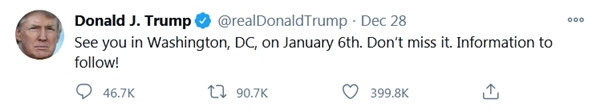 Tổng thống Trump đã đăng bài lên Twitter vào hôm 28/12 (giờ Mỹ), rằng: “Hẹn gặp ở Washington DC, vào ngày 6/1”. Mà 6/1 là ngày mà Quốc hội sẽ xác nhận người chiến thắng trong cuộc bầu cử Tổng thống Mỹ (sẽ là ông Joe Biden, nếu không có gì thay đổi). Không hiểu Tổng thống Trump “hẹn gặp” như vậy là để hứa hẹn điều bất ngờ gì.