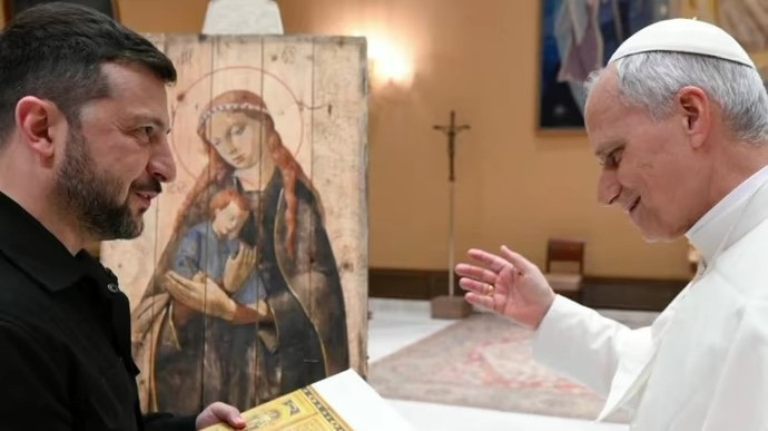 Trong bài đăng trên mạnh xã hội X ngày 18/5, Tổng thống Zelensky cho biết: "Hôm nay, chúng tôi đã tặng Giáo hoàng Leo XIV một tác phẩm đặc biệt - Đức Mẹ với Hài nhi - được vẽ trên một phần của chiếc thùng dùng để chứa đạn pháo hạng nặng, được mang đến từ Izium (tỉnh Kharkiv)".