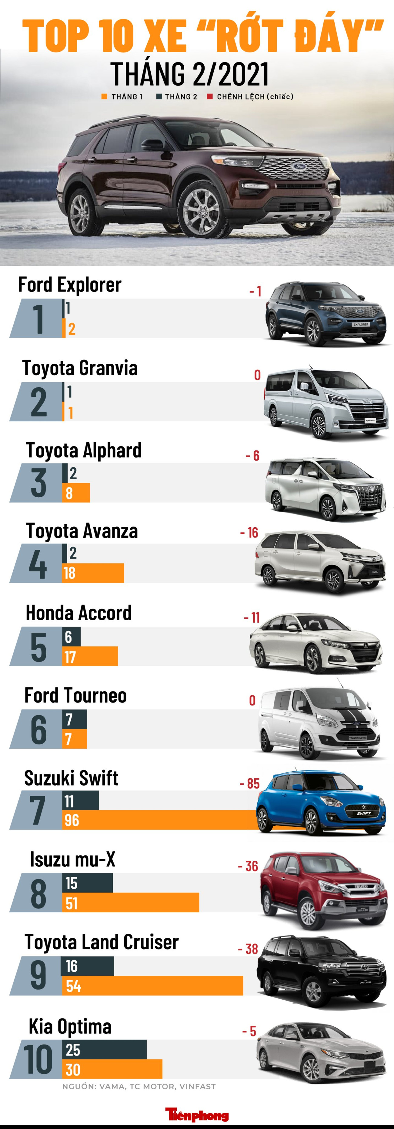 Top 10 mẫu xe bán chậm nhất tháng 2