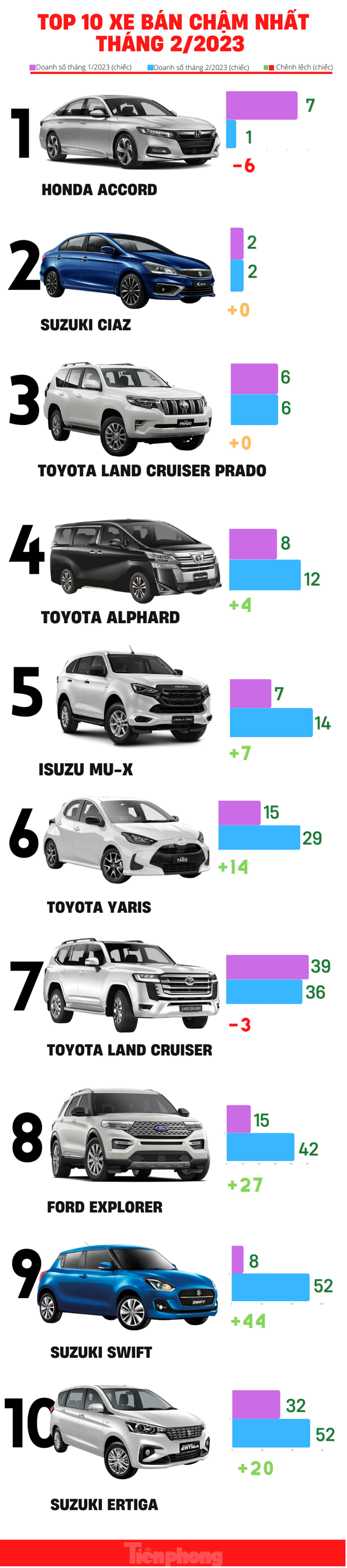 TPO - Trong bảng xếp hạng xe có doanh số thấp tháng 2, Honda gây bất ngờ khi xuất hiện tới ba cái tên, trong đó Honda Accord đứng thứ nhất với chỉ 1 xe được bán ra. Một thương hiệu Nhật Bản khác là Suzuki cũng có ba mẫu xe góp mặt.