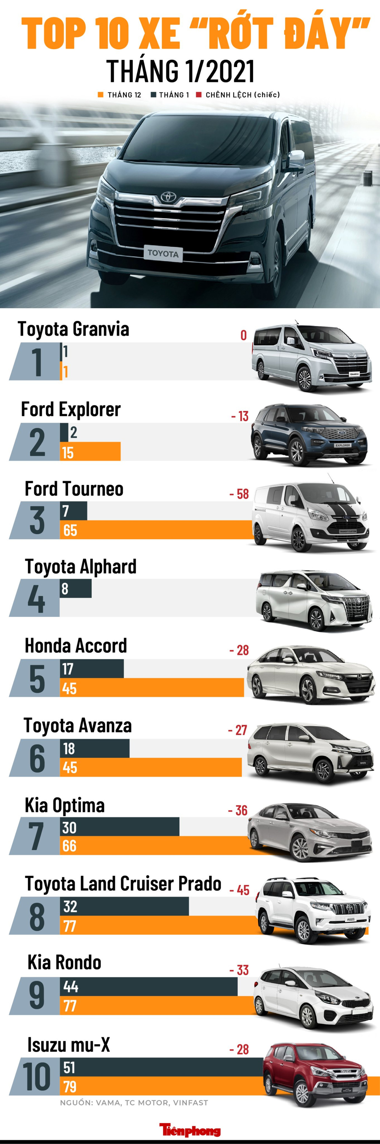 TPO - Hầu hết các các mẫu xe trong danh sách bán chậm nhất tháng đầu năm 2021 đều giảm doanh số so với tháng 12 năm ngoái, đứng đầu vẫn là Toyota Granvia quen thuộc.