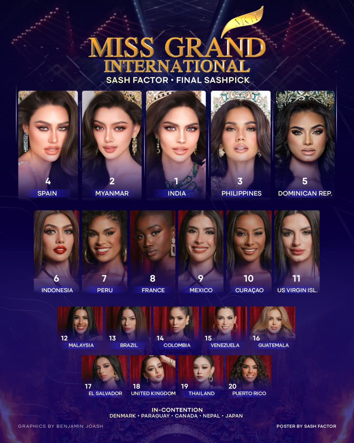 Top 20 Miss Grand International 2024 theo dự đoán của Sash Factor gồm những cái tên khá quen thuộc. Đặc biệt, chuyên trang này có dự đoán về ngôi vị Hoa hậu giống với Missosology, cả hai đều dự đoán đại diện Ấn Độ sẽ giành vương miện năm nay. Cả hai chuyên trang đều không xếp đại diện Việt Nam là Võ Lê Quế Anh trong Top 20. Cùng ngắm Top 10 Miss Grand International 2024 theo dự đoán của Sash Factor: