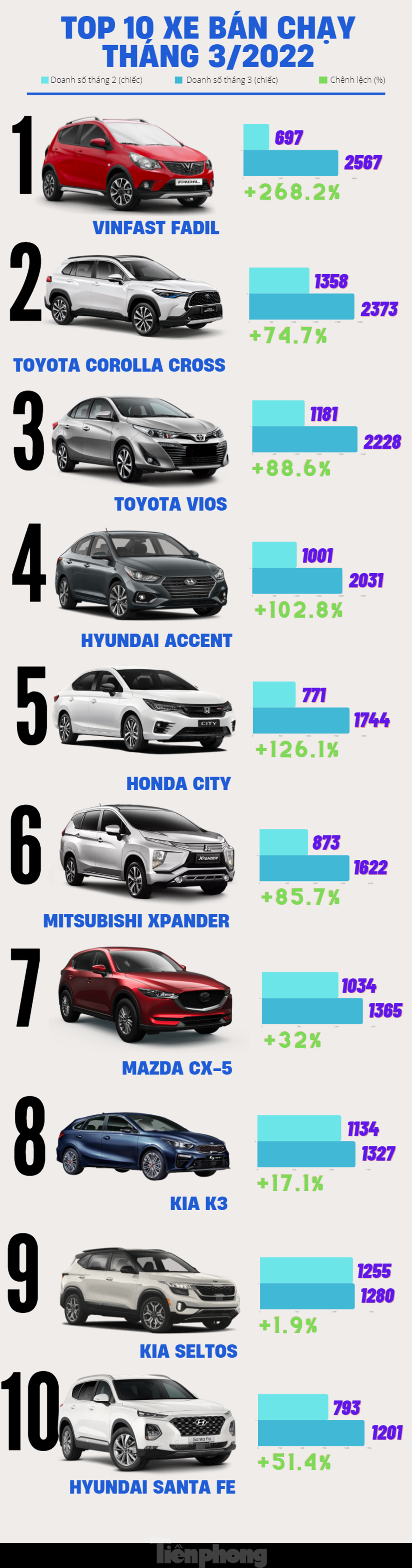 Top 10 ô tô ăn khách nhất tháng 3 tại Việt Nam