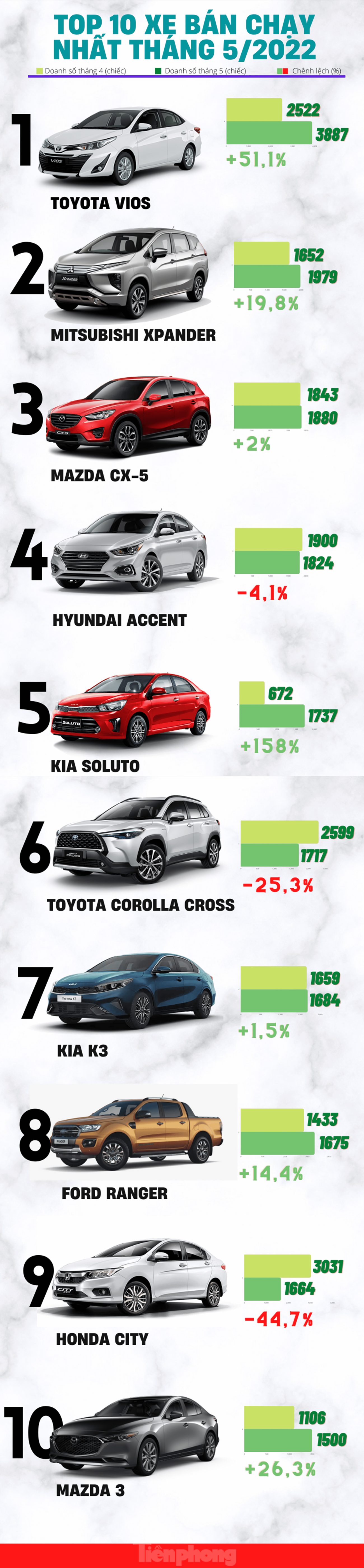 TPO - Toyota Vios và Mitsubishi Xpander có sự bứt phá để lần lượt đạt vị trí dẫn đầu và thứ hai. Trong khi đó, vài cái tên thường xuyên xuất hiện như Vinfast Fadil hay Honda CR-V đã không còn trong top 10.