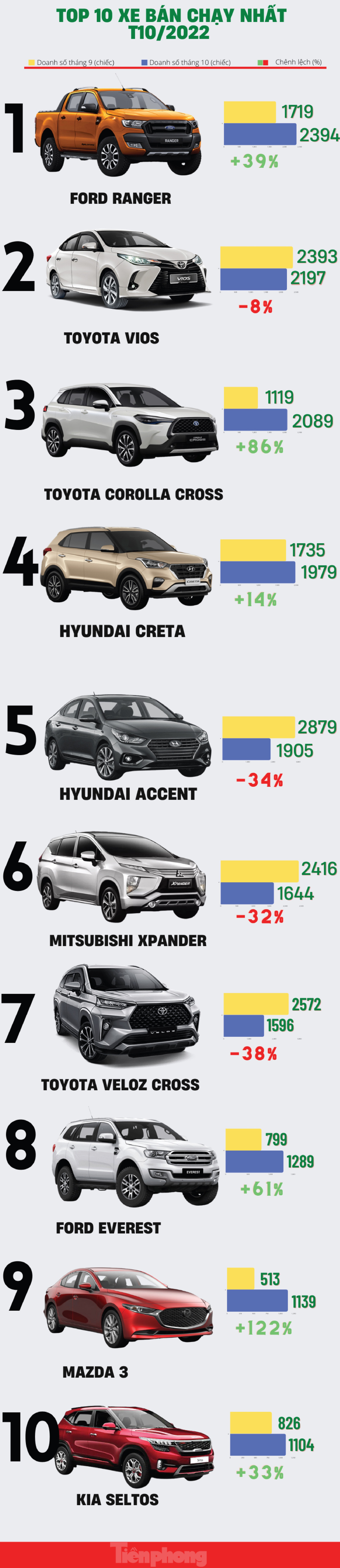 TPO - Lần đầu tiên trong năm 2022, bán tải Ford Ranger đứng đầu bảng xếp hạng doanh số tháng. Đáng chú ý, Mazda 3 cũng đang "gây mưa làm gió" tại thị trường Việt khi có mức tăng trưởng 122% so với tháng 9.
