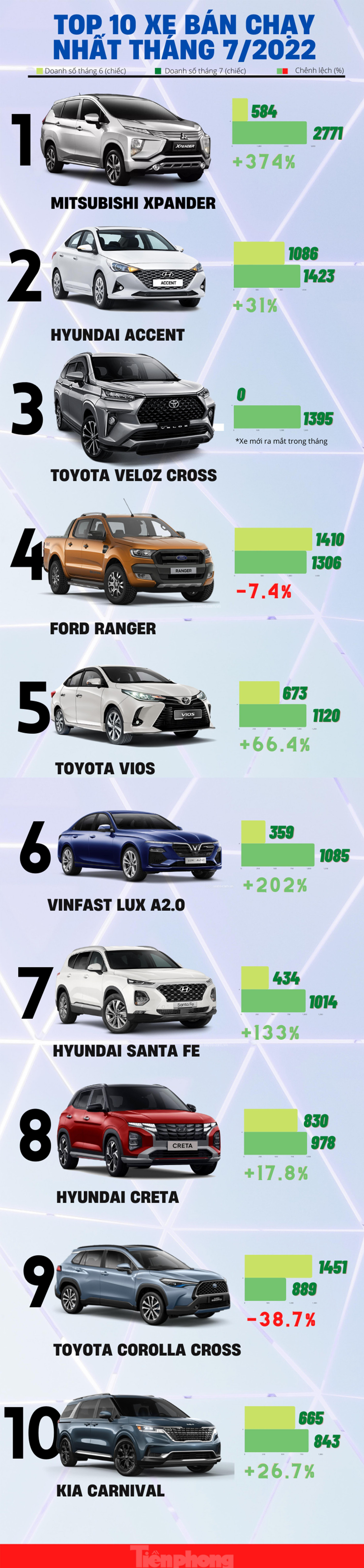 TPO - Với doanh số gần 3.000 xe bán ra trong tháng 7/2022, Mitsubishi Xpander vượt qua nhiều đối thủ dẫn đầu top 10 ô tô bán chạy nhất Việt Nam. Trong khi đó, mẫu xe mới ra mắt là Toyota Veloz Cross có pha "bứt tốc" để lọt vào top 3.