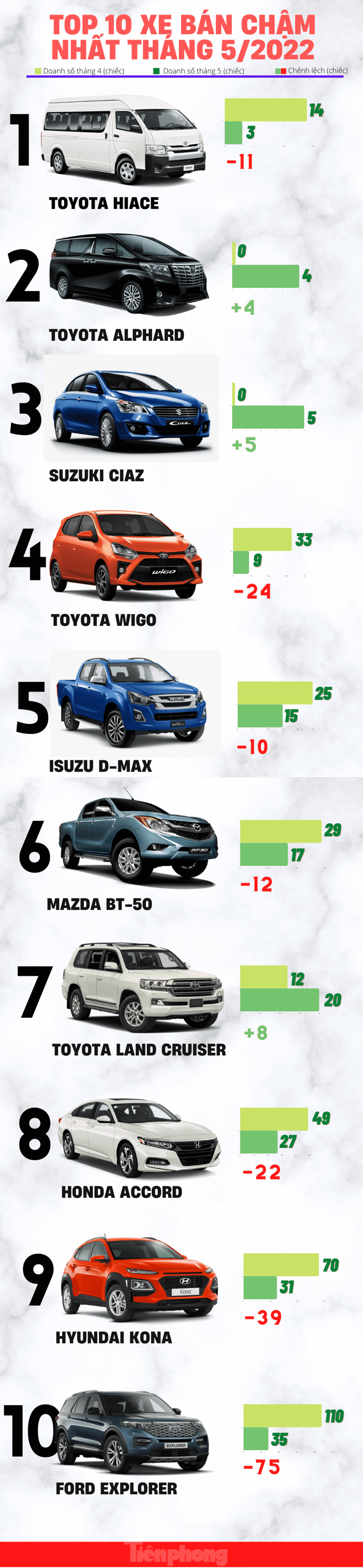 TPO - Toyota Hiace "vươn lên" dẫn đầu danh sách với 3 chiếc được bán ra trong tháng 5. Trong khi đó, Ford Explorer lần đầu góp mặt trên bảng xếp hạng.