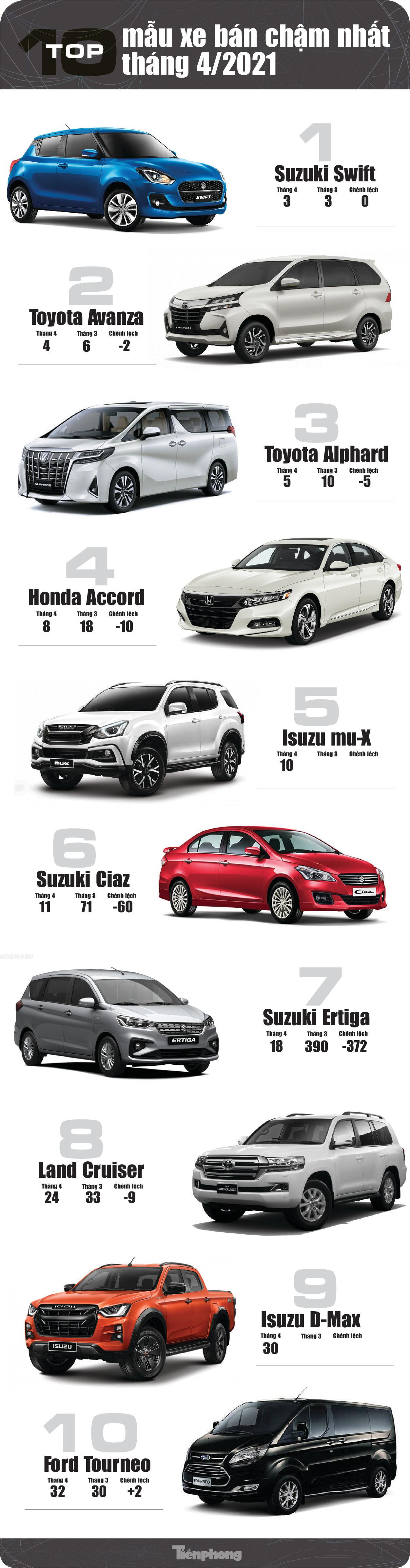 Top 10 ô tô 'rớt đáy' thị trường Việt Nam trong tháng 4