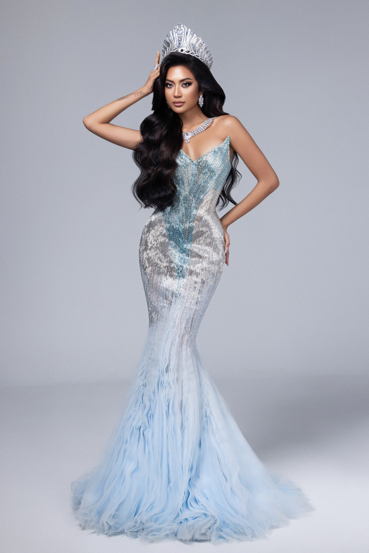 Hoa hậu Ketut Permata Juliastrid diện chiếc váy được lấy cảm hứng từ sự tan chảy của băng, mang vẻ đẹp tinh tế của sự chuyển hóa, kết hợp hài hoà giữa vẻ đẹp lạnh lùng và sự mềm mại tự nhiên.