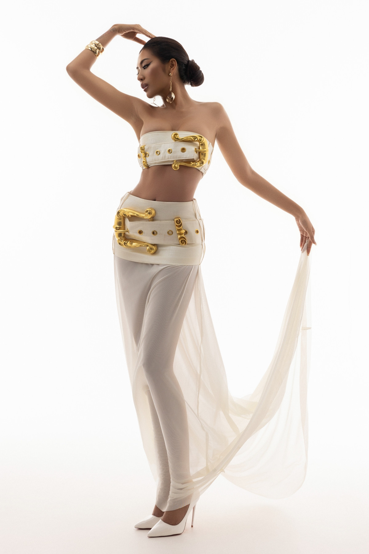 Hoa hậu Ketut Permata Juliastrid tỏa sáng trong thiết kế Helios, hiện thân của sự phá cách và độc đáo. Với thần thái tự tin, Tata mang đến hình ảnh một người phụ nữ mạnh mẽ nhưng không kém phần quyến rũ.