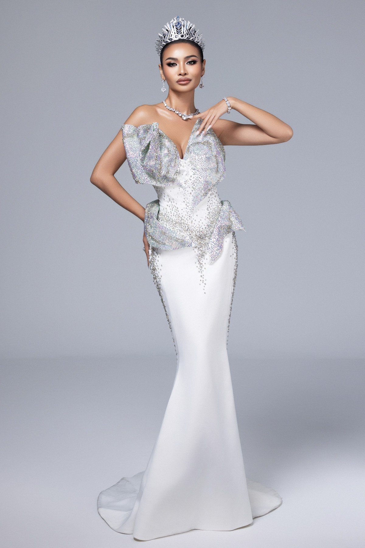 Á hậu Karnruethai Tassabut diện chiếc đầm đuôi cá màu trắng với chi tiết đính bạc lấp lánh, thể hiện vẻ đẹp sang trọng. Những ánh bạc phản chiếu dưới ánh đèn tạo nên vẻ đẹp lung linh, tôn lên đường cong mềm mại của nàng Á hậu.