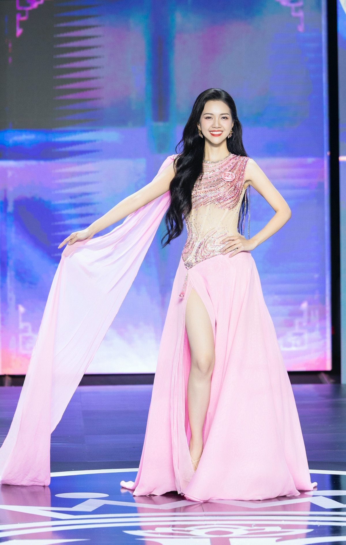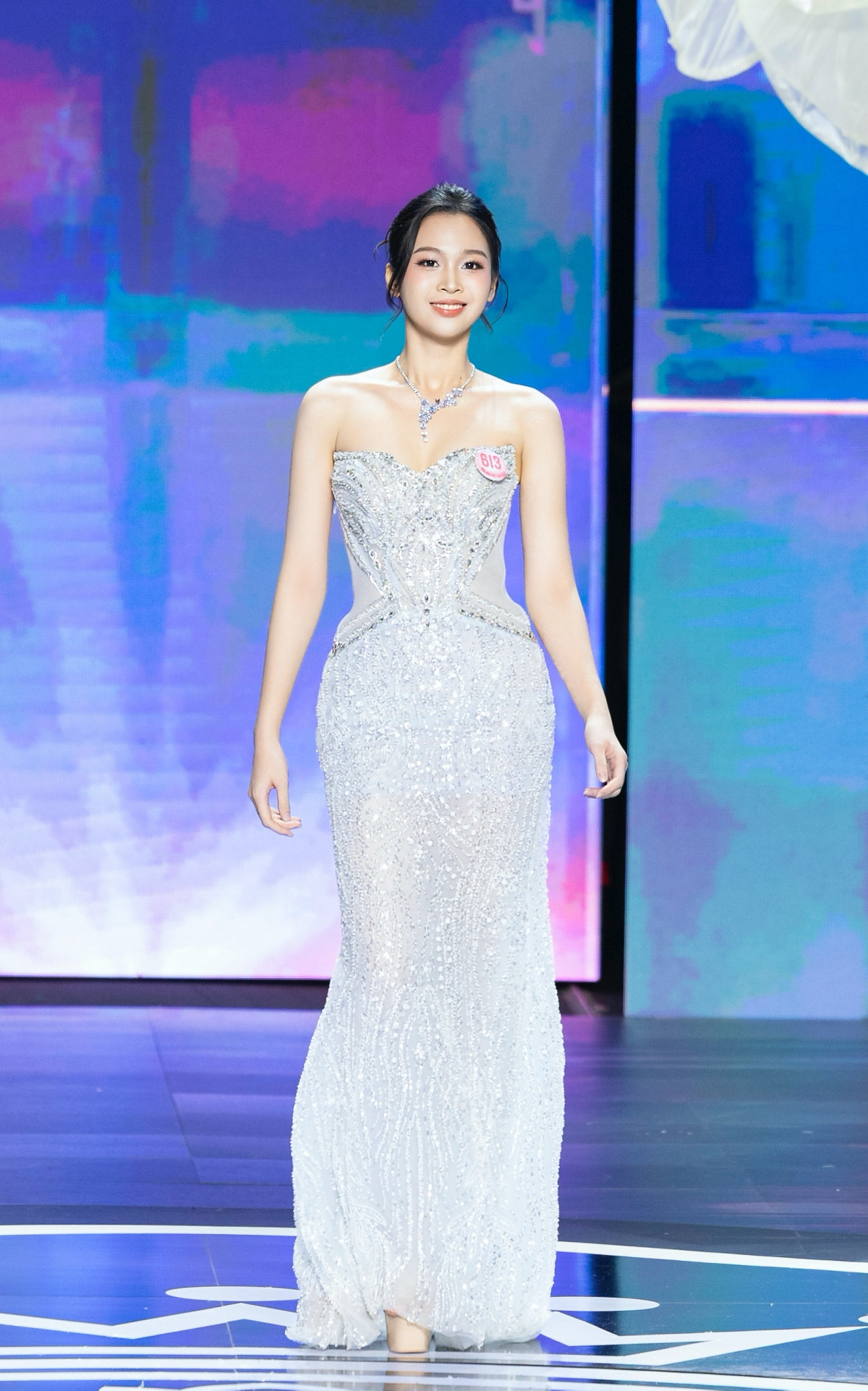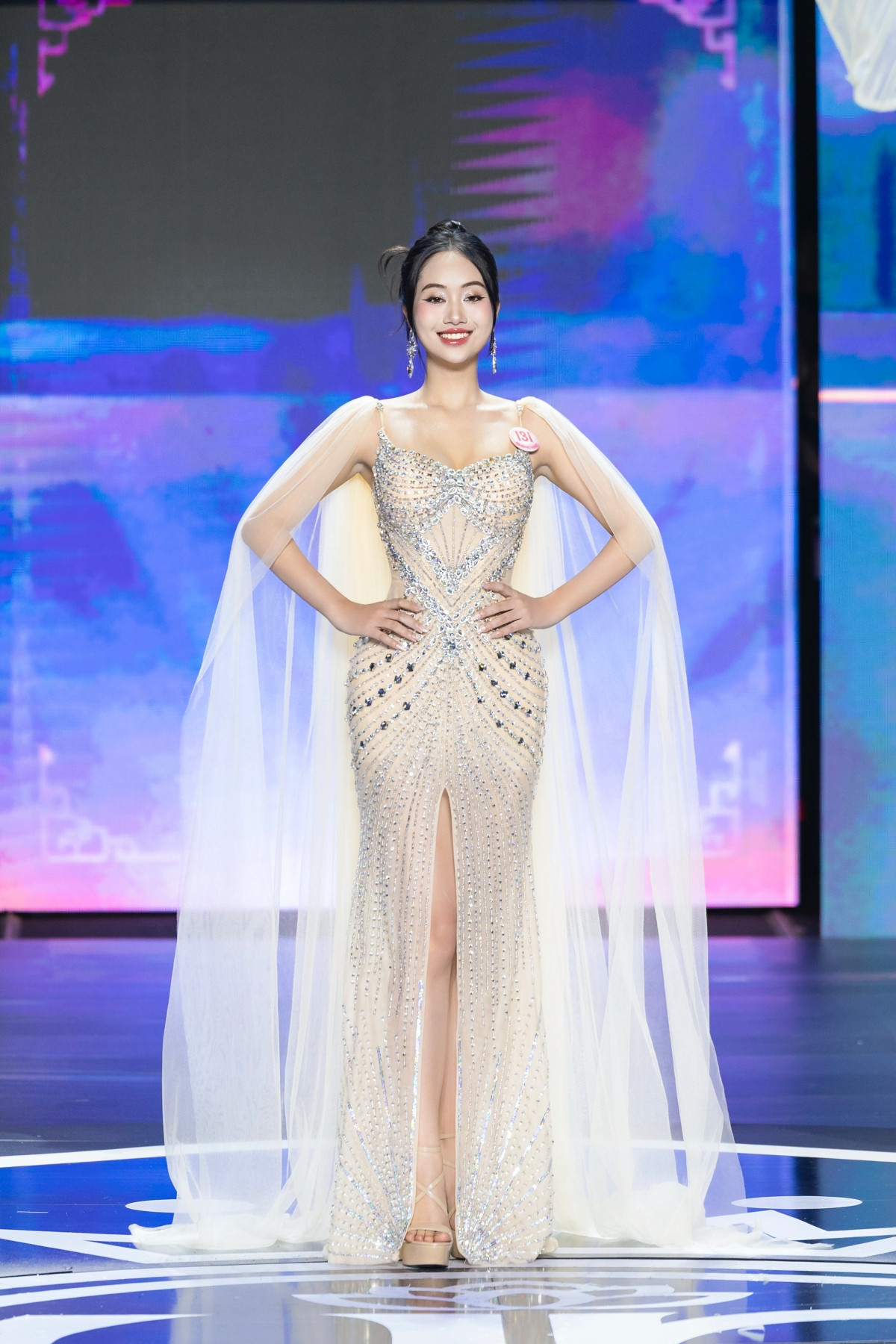 Trong phần thi trang phục dạ hội của đêm Chung khảo Hoa hậu Việt Nam 2024, từng thí sinh bước ra sân khấu với giọng thuyết trình được ghi âm sẵn của chính mình. Mỗi cô gái mang thông điệp riêng, cho thấy được khát khao phát triển bản thân và cống hiến cho xã hội.