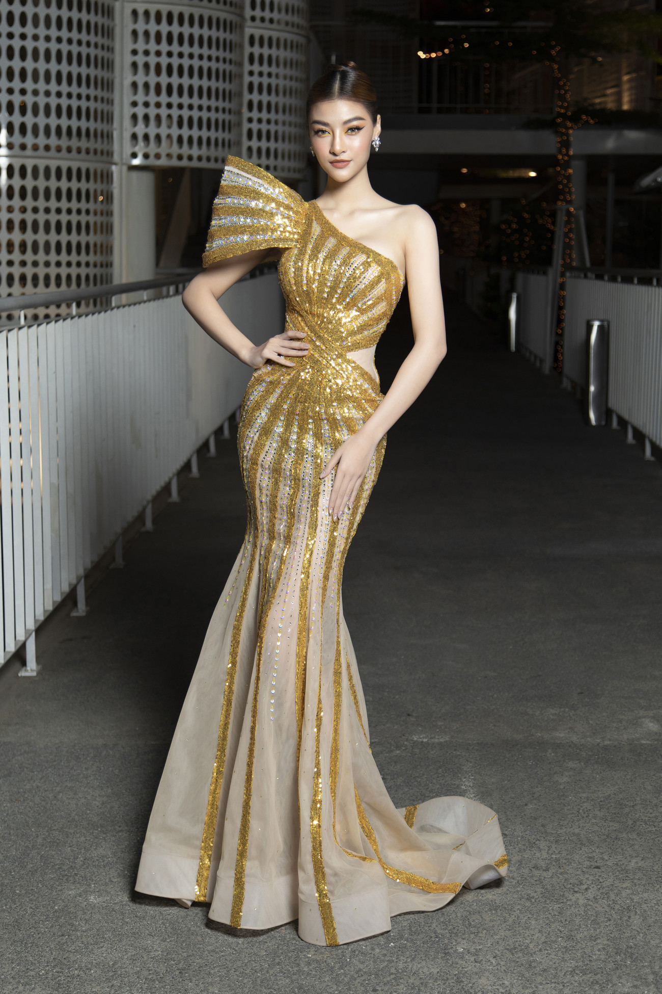 Á hậu Kiều Loan đẹp tựa 'nữ thần mặt trời' với bộ váy dạ hội màu vàng lấp lánh.