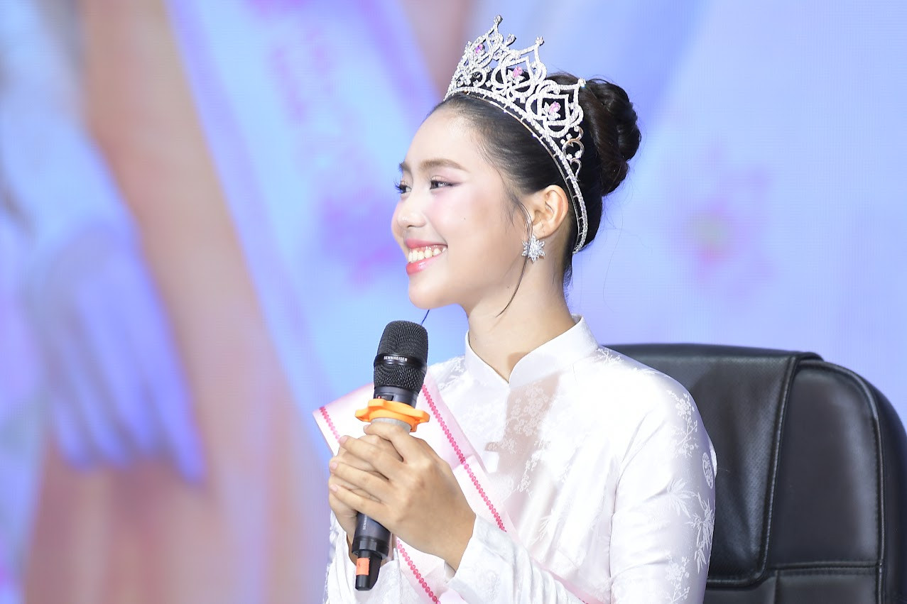 Á hậu 2 Nguyễn Thị Vân Nhi xúc động bày tỏ sự biết ơn trước sự đón tiếp nồng nhiệt từ thầy cô và sinh viên nhà trường: "Ngay khi vừa xuống xe, chúng tôi đã nhận được những lời cổ vũ nồng nhiệt và sự chào đón chân thành từ các bạn sinh viên".