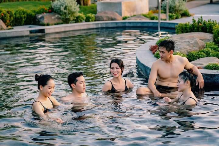 | Bạn trẻ thích thú trải nghiệm tắm suối khoáng và tắm bùn ở khu du lịch. (Ảnh: Minh Tâm) |