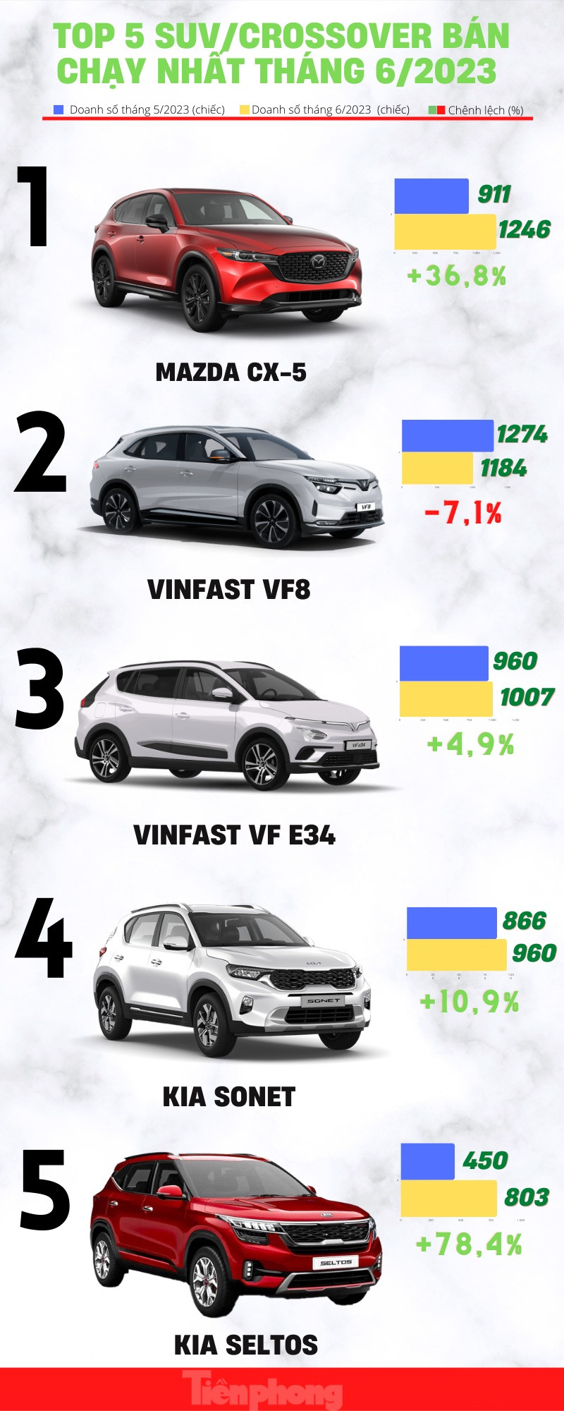 TPO - Danh sách top 5 SUV, crossover bán chạy nhất tháng 6 chứng kiến nhiều biến động so với tháng trước đó. Mazda CX-5 đạt doanh số dẫn đầu với doanh số 1.246 xe. VinFast và Kia gây chú ý bởi đều có 2 sản phẩm xuất hiện trong danh sách này.