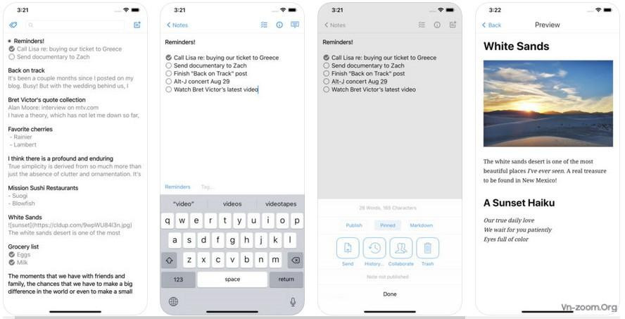 Để giúp bạn nhớ khi nào cần tham khảo ghi chú của mình, bạn có thể thiết lập nhắc nhở dựa trên thời gian hoặc theo vị trí để bạn nhớ làm điều gì đó tại một địa điểm cụ thể hoặc tại một thời điểm cụ thể. Và như một phần thưởng bổ sung cho việc gõ quá bất tiện, tính năng ghi nhớ giọng nói của ứng dụng cho phép bạn ghi lại một tin nhắn cho một lưu ý nhanh dưới định dạng âm thanh.