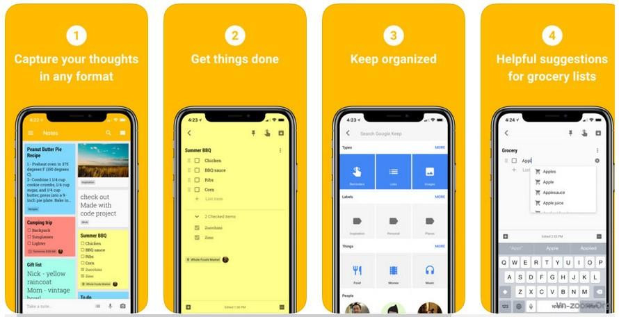 Đối với một ứng dụng ghi chú có cách tiếp cận trực quan hơn, ghi chú trên thẻ của Google Keep hoàn hảo cho những ai muốn xem tất cả các ý tưởng, danh sách, hình ảnh và clip âm thanh của họ ở cùng một nơi. Bạn có thể mã hoá các ghi chú của mình hoặc thêm nhiều thuộc tính khác vào chúng để dễ tìm và chia sẻ với những người cần truy cập và chỉnh sửa khác. Giống như Evernote và Simplenote, bất kỳ thay đổi nào của bạn hoặc những người dùng được chia sẻ khác sẽ tự động đồng bộ hóa lên trên tất cả các nền tảng.