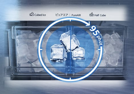 Tiến đến ngăn đông, khách tham quan không khỏi ấn tượng với hệ thống làm đá tự động, có khả năng tạo ra hai kích thước khác nhau cho mọi nhu cầu giải khát, từ thức uống giải nhiệt mùa hè cho đến tiệc tiếp khách sang trọng tại nhà. Mỗi viên đá đều được lọc qua ba cấp độ, đảm bảo tinh khiết và an toàn cho mọi thành viên trong gia đình.
