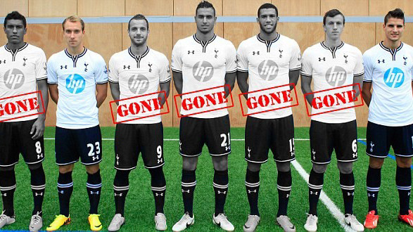 7 tân binh Tottenham đưa về trong kỳ chuyển nhượng hè 2013. Lần lượt từ trái sang: Paulinho, Christian Eriksen, Roberto Soldado, Nacer Chadli, Etienne Capoue, Vlad Chiriches và Erik Lamela. Tổng cộng, Spurs đã chi 108,6 triệu bảng trong phiên chợ hè cách đây 3 năm