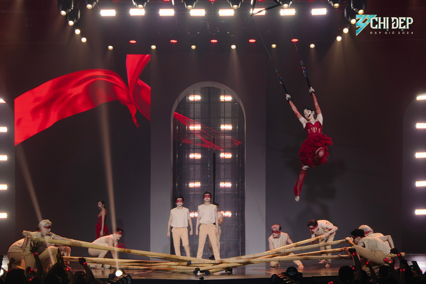 Không chỉ chinh phục khán giả bằng giọng hát cuốn hút, tiết mục còn gây ấn tượng với phần dàn dựng đầy sáng tạo và thử thách. Cả ba Chị Đẹp đã thể hiện những pha đu dây, leo cột và bay lượn trên không kết hợp khéo léo cùng tre tạo nên một màn trình diễn đậm chất nghệ thuật. Đặc biệt, giọng ca Có Ai Thương Em Như Anh còn khiến khán giả trầm trồ khi thực hiện những vòng xoay đu bay liên tục ở độ cao 2 mét.