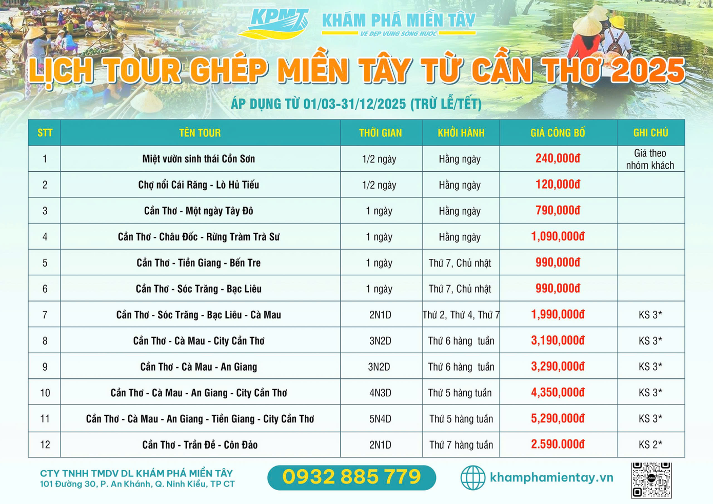 KPMT công bố lịch tour miền Tây khởi hành từ Cần Thơ với 12 chương trình tour nổi bật, khởi hành định kỳ theo các ngày trong tuần (thứ 2, thứ 4, thứ 6 và thứ 7), giúp du khách dễ dàng lựa chọn theo thời gian rảnh.