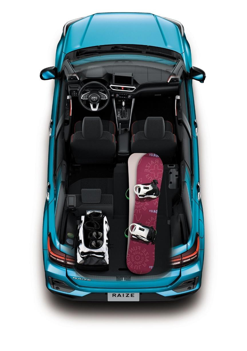 Nội thất của Raize vẫn là sự rộng rãi vốn có trên các mẫu xe Toyota, bên cạnh đó là những trang bị tiện nghi hiện đại không hề thua kém các mẫu xe đàn anh. Khởi động nút bấm với chìa khoá thông minh, lẫy chuyển số thể thao ngay trên vô lăng, màn hình giải trí 9 inch đa kết nối điện thoại thông minh, điều hoà tự động, màn hình trước người lái 7 inch kỹ thuật số với các cách hiển thị khác nhau. Khoảng để chân cũng như không gian tựa đầu ghế của hàng ghế thứ 2 rất thoải mái. Không gian cốp xe rất linh hoạt với nhiều cách sắp xếp khác nhau, nếu gập phẳng hàng ghế thứ 2 bạn sẽ có gần 1.200L để chứa đồ. Đặc biệt, Raize sở hữu rất nhiều các hốc chứa đồ từ các cánh cửa, bệ tì tay, giá để cốc ngay trước cửa gió điều hoà cho tới khay nhỏ đựng giày ở dưới hàng ghế hành khách thứ nhất.