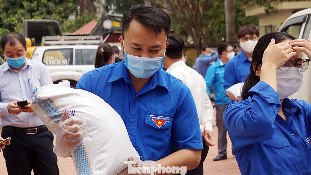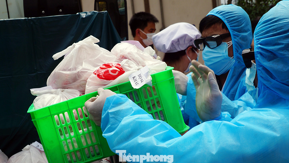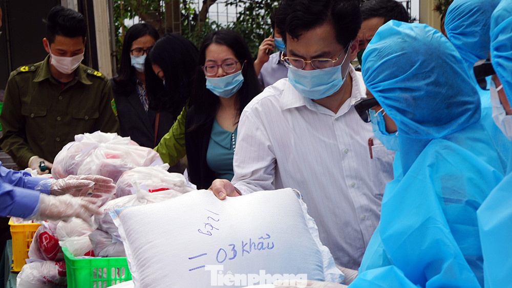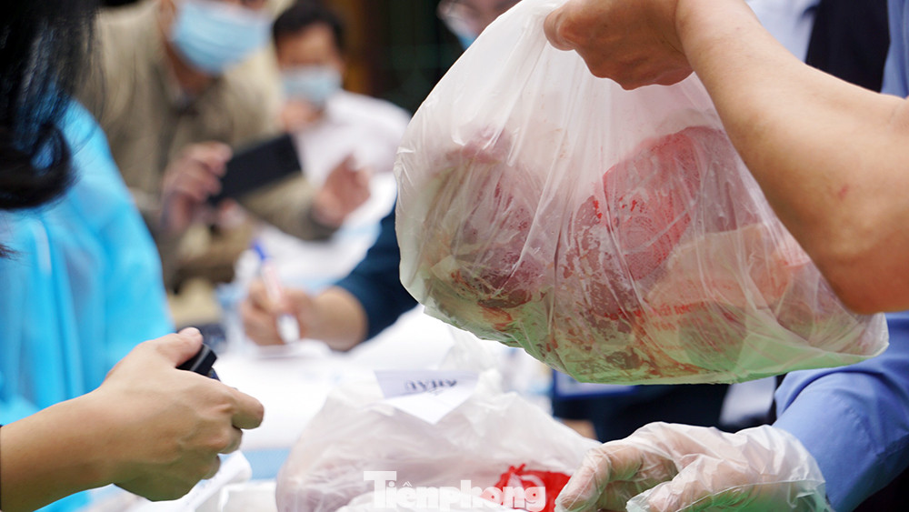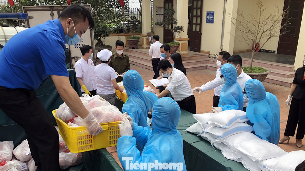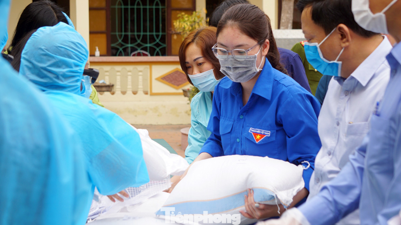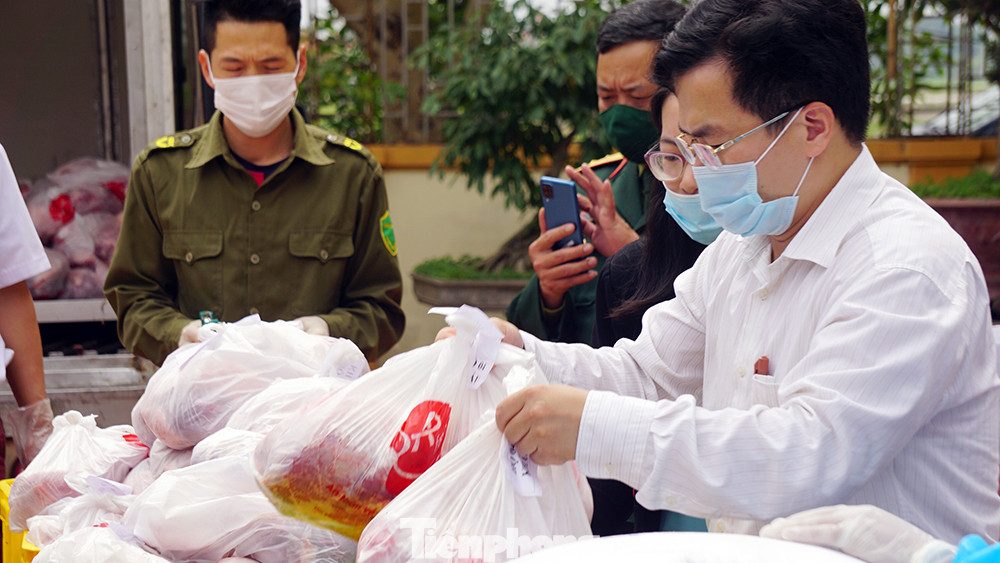 Gạo đóng túi theo số lượng nhân khẩu trong từng hộ gia đình, thịt lợn tươi sạch được đóng gói cũng theo nhân khẩu từng hộ gia đình. Số thực phẩm này được chuyển, bàn giao cho UBND xã, phường, nơi quản lý khu phong tỏa để phát cho từng hộ dân.