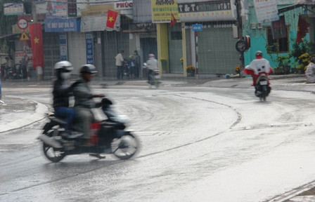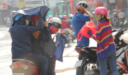 Khoảng 15h ngày 19/2 (mùng 1 Tết Ất Mùi), khi nắng nóng vừa tắt, bầu trời ở một số khu vực vùng ven TPHCM như Thủ Đức, quận 9; TX Dĩ An (tỉnh Bình Dương) mây đen dày đặc rồi trời đổ mưa khá nặng hạt, kéo dài đến gần 15h30 khiến nhiều người đi đường bất ngờ vì không chuẩn bị áo mưa.