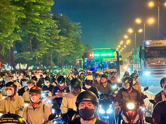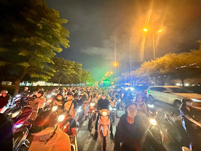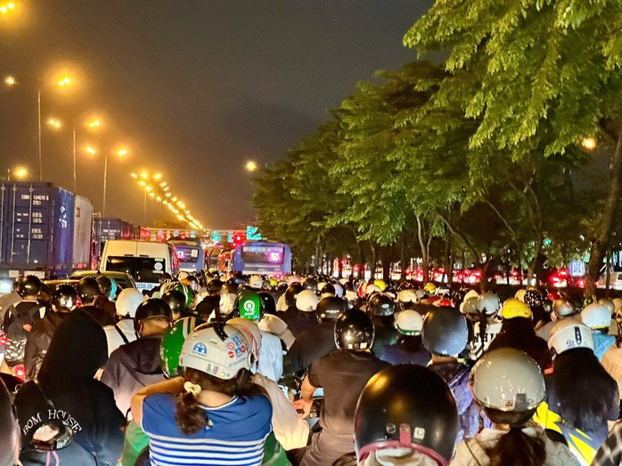 Tối 23-5, theo ghi nhận của phóng viên, đến hơn 19 giờ, khu vực giao lộ Võ Nguyên Giáp – Đỗ Xuân Hợp (thuộc TP Thủ Đức), đoạn qua ngã tư Bình Thái, vẫn trong tình trạng kẹt xe nghiêm trọng. Dòng phương tiện di chuyển chậm chạp, xe máy ken đặc, gần như không còn khe hở để len lỏi.