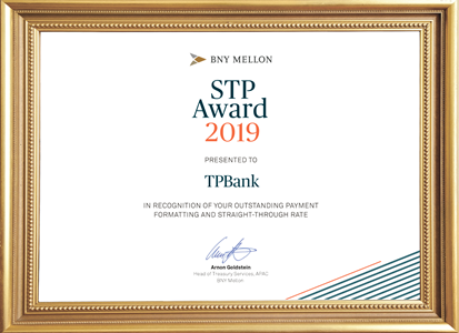 Giải thưởng Chất lượng thanh toán quốc tế xuất sắc được Ngân hàng Bank of New York Mellon (BONY) của Mỹ trao tặng cho TPBank với tỷ lệ đạt chuẩn STP (Straight Through Processing) gần 98%. STP là một tiêu chí quan trọng để đánh giá chất lượng thanh toán quốc tế của các ngân hàng trên thế giới với các tiêu chuẩn khắt khe của BONY dựa trên số lượng, tốc độ và sự chuẩn xác về chất lượng thanh toán quốc tế.