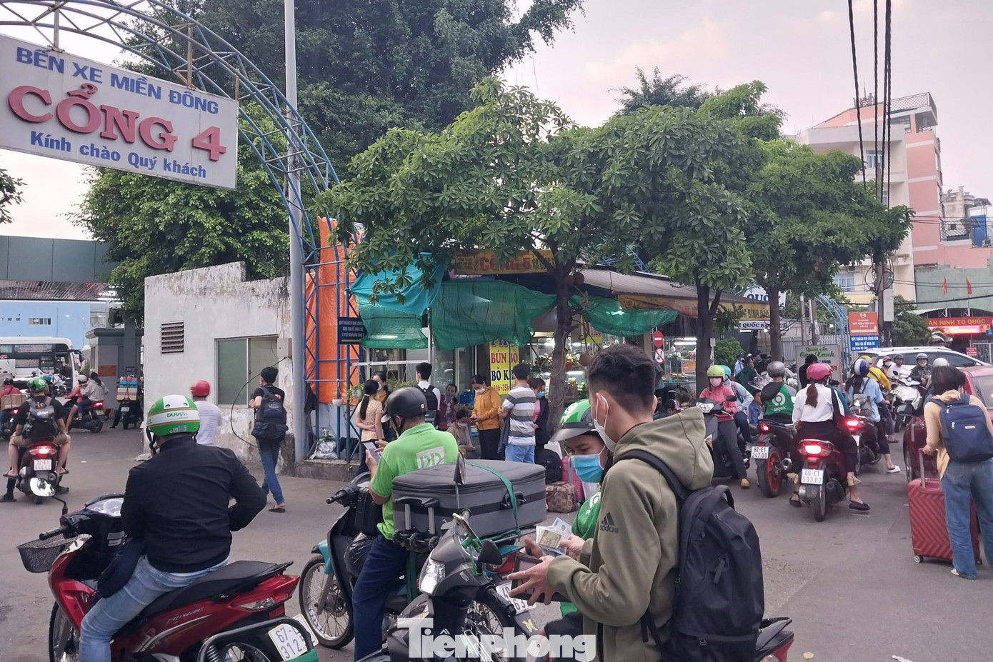| Tại khu vực cổng ra vào số 3 và cổng số 4 của bến xe Miền Đông có rất đông phương tiện nối đuôi nhau xếp hàng chờ mua vé vào bên trong bến để trả khách. |