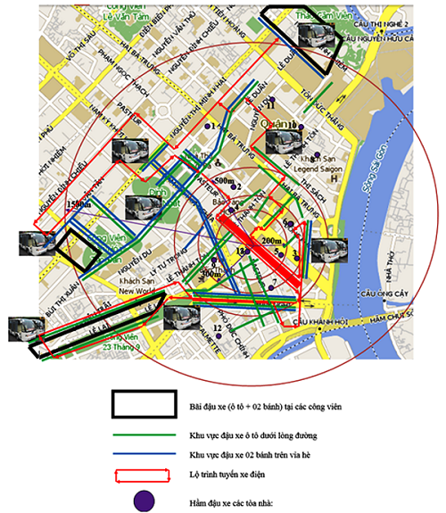 Theo đó, TP.HCM bố trí tầng hầm 13 cao ốc để giữ xe trên địa bàn quận 1, gồm: 1. tòa nhà Kumho Asianna Plaza (số 9 Lê Duẩn); 2. Trung tâm thương mại, văn phòng, căn hộ cho thuê và bãi đậu xe ngầm (số 70 Tôn Đức Thắng); 3. Cao ốc văn phòng, trung tâm thương mại và căn hộ cho thuê (số 34 Tôn Đức Thắng); 4. Khu phức hợp Eden giới hạn 04 tuyến đường Nguyễn Huệ - Lê Lợi – Đồng Khởi – Lê Thánh Tôn; 5. Trung tâm thương mại, cao ốc văn phòng, căn hộ cao cấp, khách sạn (số 22-36 Nguyễn Huệ, 57-69F Đồng Khởi); 6. Cao ốc văn phòng (số 5 Công trường Mê Linh); 7. Trung tâm thương mại, văn phòng, dịch vụ, tài chính (số 45 Ngô Đức Kế); 8. Cao ốc văn phòng, khách sạn (số 3C Tôn Đức Thắng); 9. Cao ốc Sài Gòn Center (số 65 Lê Lợi); 10. Trung tâm thương mại, văn phòng và căn hộ cho thuê (số 1-1A-2 Tôn Đức Thắng); 11. Nhà điều hành sản xuất (số 35 Tôn Đức Thắng); 12. Tòa nhà văn phòng (số 180-182 Nguyễn Công Trứ); 13. Cao ốc Sunwah (số 115 Nguyễn Huệ).