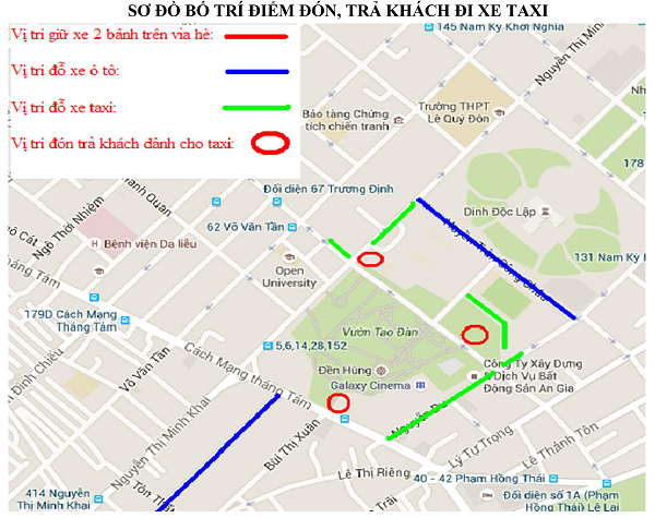 Riêng phần đường bên trong Công viên Tao Đàn (có thể lưu thông vào theo 2 hướng từ đường Trương Định và Huyền Trân Công Chúa vào vị trí đỗ xe được bố trí tại khu vực sân bóng chuyền) cho phép 20 xe đỗ trên phần đường nội bộ tại khu vực sân bóng chuyền. Ngoài ra, TP.HCM bố trí 10 điểm dừng đỗ taxi để đón khách tại khu vực đường vòng cung nội bộ bên trong Công viên (trên đường Trương Định).