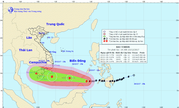 Theo Bản tin dự báo của Trung tâm Dự báo Khí tượng thủy văn Trung ương: hồi 13 giờ ngày 23/12 vị trí tâm bão ở vào khoảng 7,7 độ Vĩ Bắc; 118,8 độ Kinh Đông, cách đảo Pa-la-oan (Philippin) khoảng 180km về phía Đông Nam.